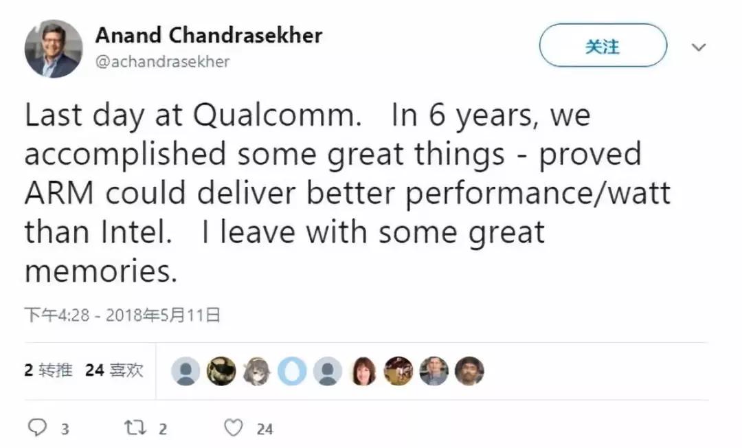 5 月,高通考虑出售或关闭服务器芯片部门的消息传出后不久,曾为高通效力六年的数据心主管 Anand Chandrasekher 也在个人 Twitter 上确认了离职消息。2012 年,Anand 从 Intel 跳槽到高通领导市场营销业务,在 2013 年末被任命为数据中心部门的总裁。