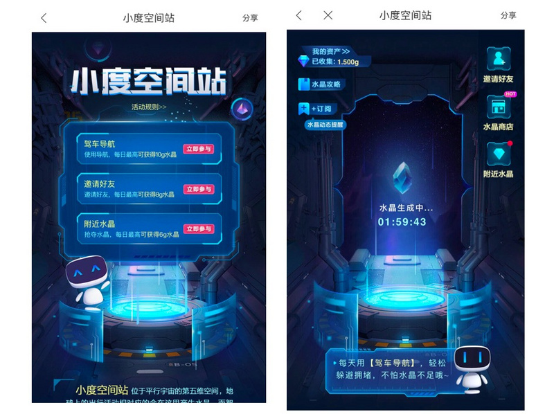 如何获取水晶的方式也大同小异:一为新手水晶,用来发放给新玩家;二为成长水晶,即空间主页中每隔两小时生成的随机数水晶;三为导航水晶,使用驾车导航的玩家每行驶 0.2-0.5 公里,即可随机获得水晶(最高上限为 20 公里);四为好友水晶,即邀请好友获得的水晶奖励,好友数目无限制;五为附近水晶,玩家可在百度地图上附近区域(以自身定位为圆心,200m 为半径的圆形区域)抢夺水晶,但需在 2 小时之内“逃离”该区域才可真正获得。