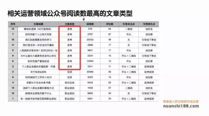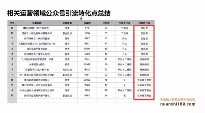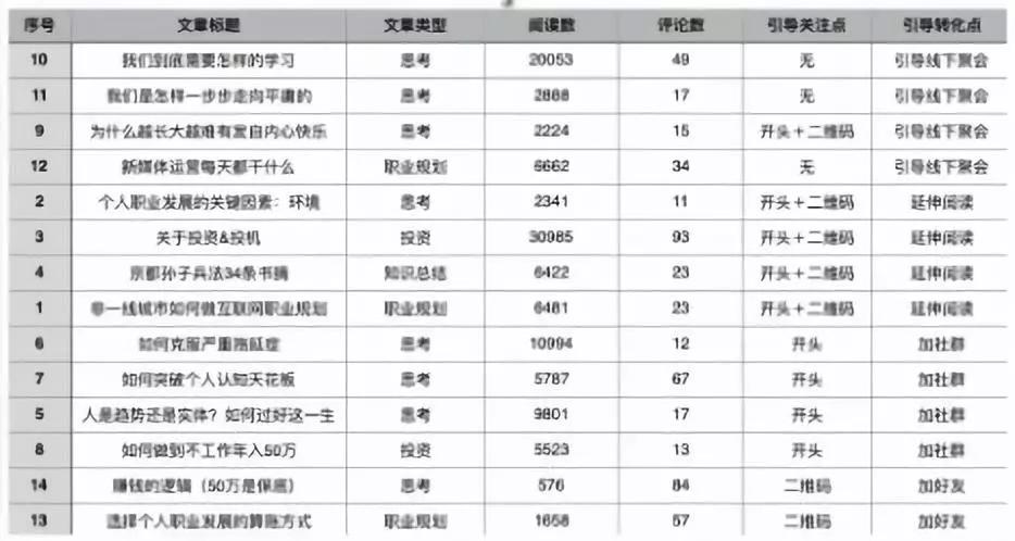 又比如,总结公众号文章引流转化点,有的是加好友,有的是加社群,有的是延伸阅读,有的是引导线下聚会,可以通过数据的筛选做一个整理和分类。