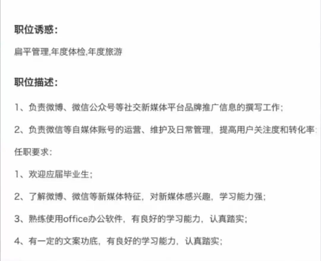 了解微信公众号、微博的特征,对新媒体感兴趣,学习能力强,有一定的文案功底。