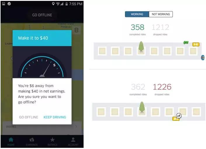 然而,按照心理学的思路,Uber有不少手段可以在不加价的情况下让司机心甘情愿地多接单。利用行为科学家和数据分析师的研究支持下,Uber对与司机的沟通系统和界面做了系列调整:比如,当司机每一次试图下线时,APP都会发送一条类似于“你离赚取220美元(通常是一个整数收入目标)只差8美元了,真的确定要下线吗”的消息,消息后面跟着两个选项“离线”和“继续驾驶”,后一个选项被高亮突出显示(相当于默认选项)。