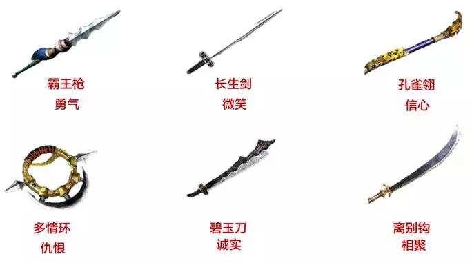 譬如在霸王枪这本书里面,实际上讲的武器是“勇气”,勇气能够帮助你战胜敌人。长生剑寓意的是“微笑”;孔雀翎寓意的是“信心”。“多情环”寓意的是“仇恨”;碧玉刀寓意的是“诚实”;离别钩寓意的是“相聚”。