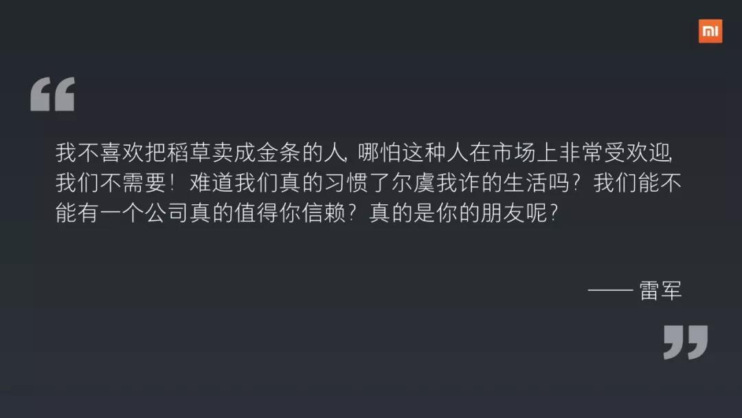 这句话,其实是这封公开信引发的最大共鸣点。而这个点,其实源于小米的价值观。黎万强在上市晚宴上对这句话有过一段解释:“厚道”是小米的价值观;小米的价值观是历史形成的,八年磨砺,方得真言;小米价值是一切行动的原则,是基本法的基本法。
