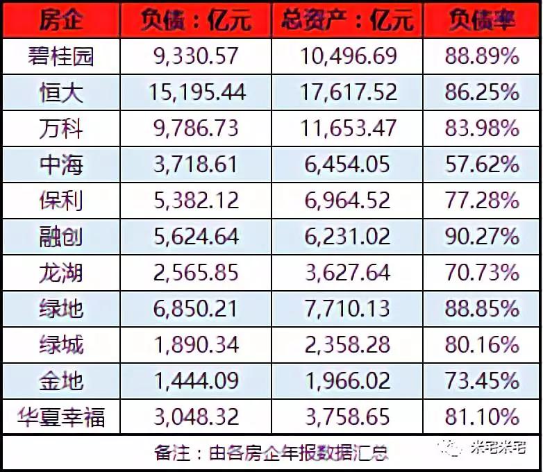 根据企业年报数据,统计范围内的11个全国一线房企,融创负债率高达90.27%,碧桂园、绿地、恒大、万科、绿城、华夏幸福6家房企负债率均超80%。