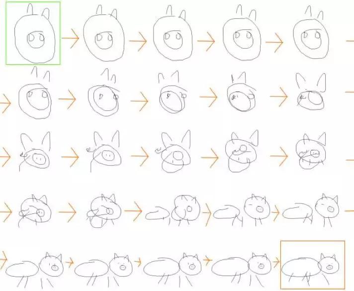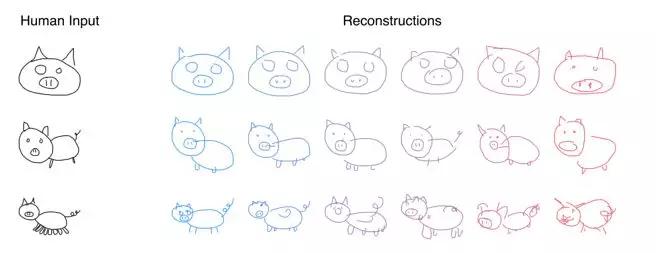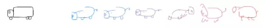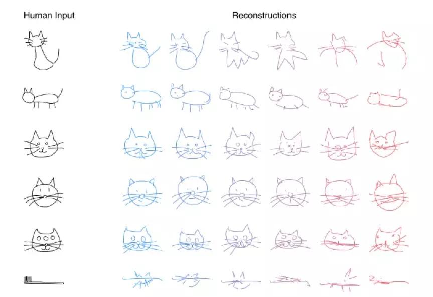 研究人员在人类涂鸦数据集中训练神经网络,让AI来理解人们在绘制涂鸦时是在何时起笔、走笔方向、何时停笔的。当经过训练的RNN模型接收到人类绘制的涂鸦后,会生成一张类似的新涂鸦: