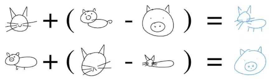 比如上图,模型将“身体”部分进行了类比,选择给猫头涂鸦加上身体,或是将“完整小猪”中的身体去掉,只剩下猪头。