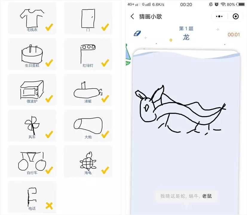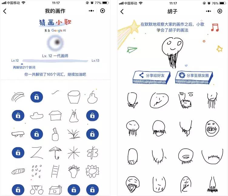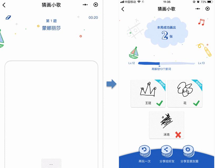 什么意思呢?相比通关游戏最终分享到社交圈的是分值,或是通过了多少关卡,这种被商家量化了的东西。「猜画小歌」最终分享到社交圈的是实实在在的“画作”,是玩家自己创作的结果。