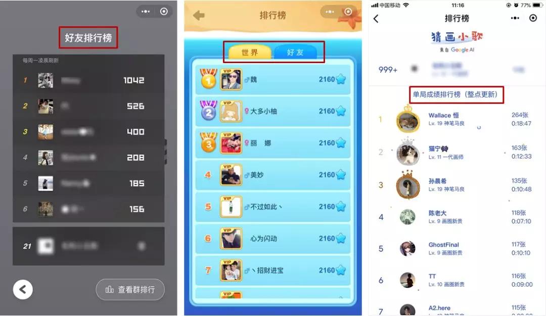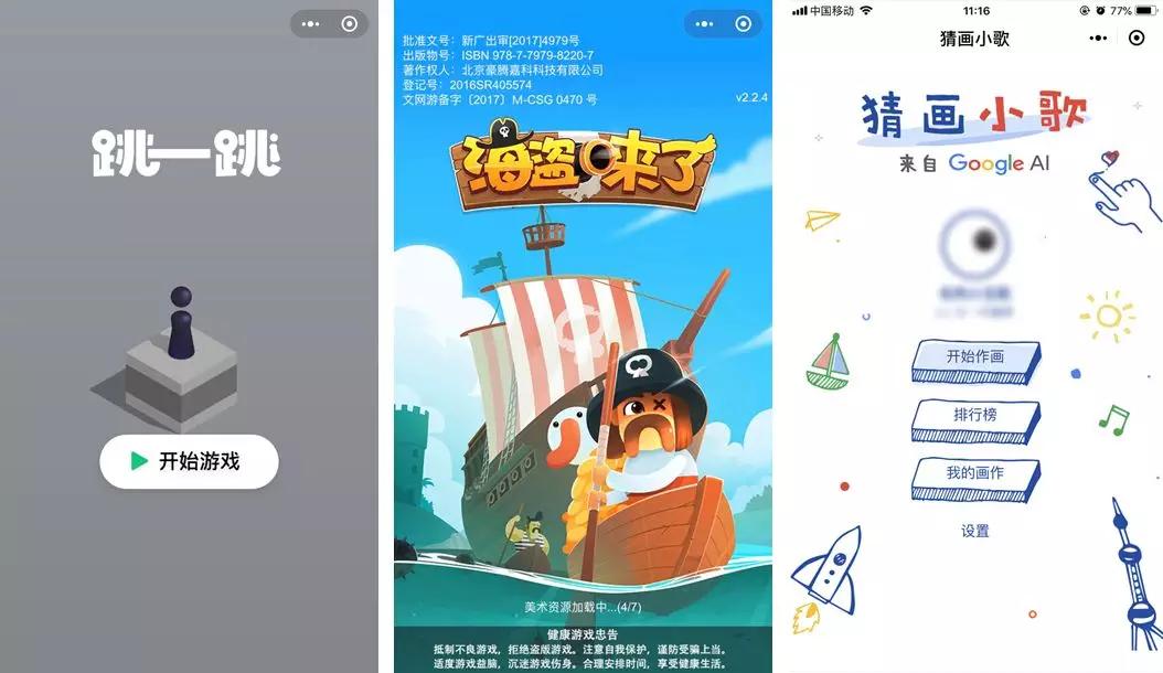 不同的是「跳一跳」的排行榜可以选基于好友的排行,或是某个群的排行。「海盗来了」的排行可以是好友排行,或是世界排行。「猜画小歌」的排行是总榜排行。