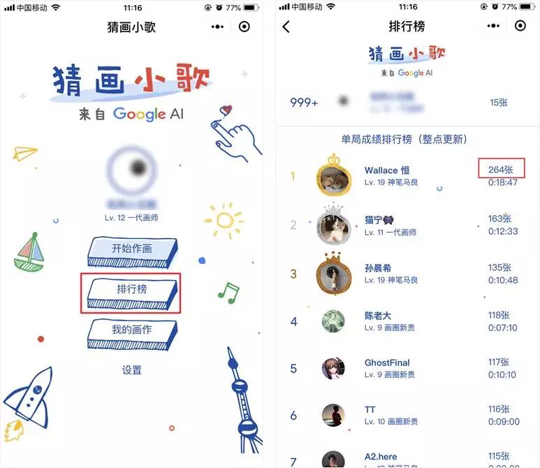 除此之外,在【排行榜】中还能够看见你单局的成绩在所有参与者中的排名。(那个单局画出 264 张图片的小哥是得多猛……)