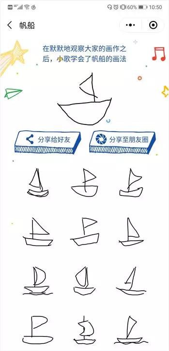 首先,用户点击自己画的单幅画作,能看到不同的人对同一个事物(绘画)的不同理解。比如,同样是帆船,大家画出来竟是这般五花八门。