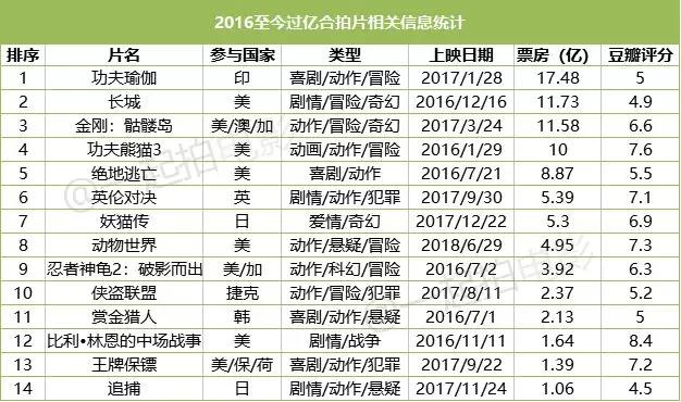 从图表中也可以看到,从2016年至今,国内一共产出了14部过亿的合拍片。其中,中美合拍片就有8部,此外,还有中日合拍的《妖猫传》《追捕》,中印合拍的《绝地逃亡》等。而且,纵观这些合拍片,大部分都是动作冒险的视效大片。