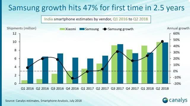 三星电子该季度的智能手机销量增长了47%。三星在印度市场已经耕耘多年,长期占据了宝座地位,取得一半的增长实属不易。去年同期,三星市场份额为25%。