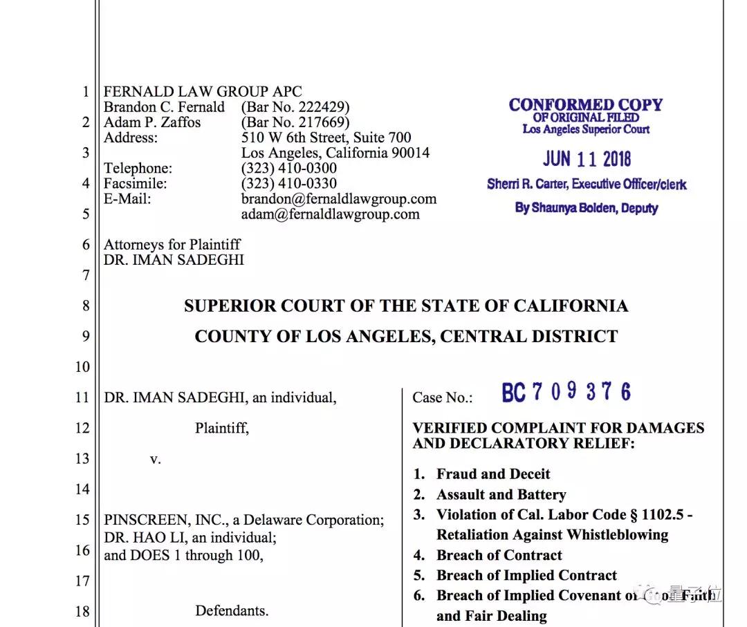 在提交给洛杉矶高等法院的诉状上,Iman列出了Pinscreen和黎颢的诸多罪名,比如欺诈、殴打、违反劳动法、违约等等。