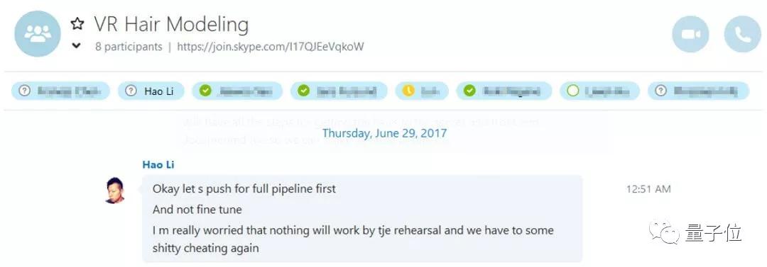 2017年6月29日,离8月1日的RTL演示只剩一个月时间,黎颢在他们讨论VR Hair Modeling的群里说:我很担心到彩排的时候什么都没用,又得可耻地作弊了。