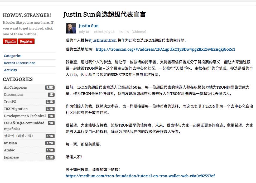 孙宇晨本人发表的竞选超级代表宣言中,表示通过其个人的参选,能让每一位波场的持币者、支持者和信仰者充分了解投票的意义。并表示,由于参选是其个人行为,因此基金会锁定的 332 亿 TRX 并不参与此次投票。不过,作为该基金会的 CEO,孙宇晨在声明中并未披露自己持有多少数量的 TRX。