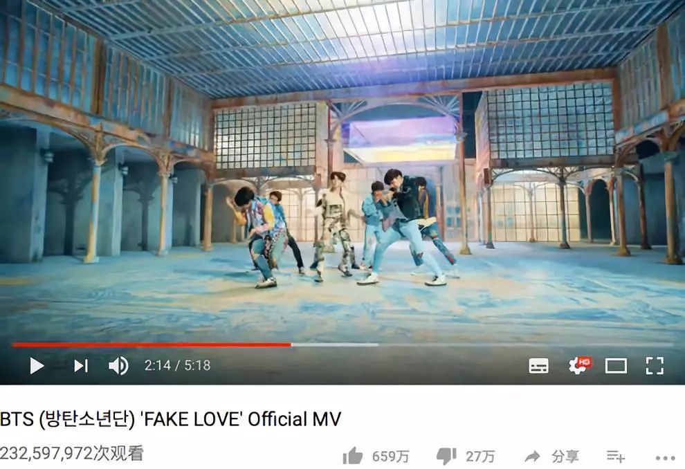 《Fake Love》油管播放量5小时内破千万,9天内破亿,44天突破2亿