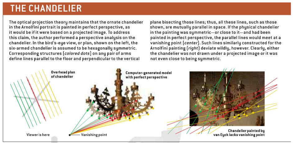 也有研究表明扬·范·艾克的画作没有使用光学辅助设施,一个证据是画面中的六脚蜡烛驾透视比例不和谐