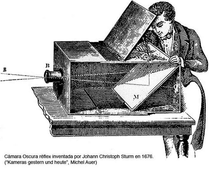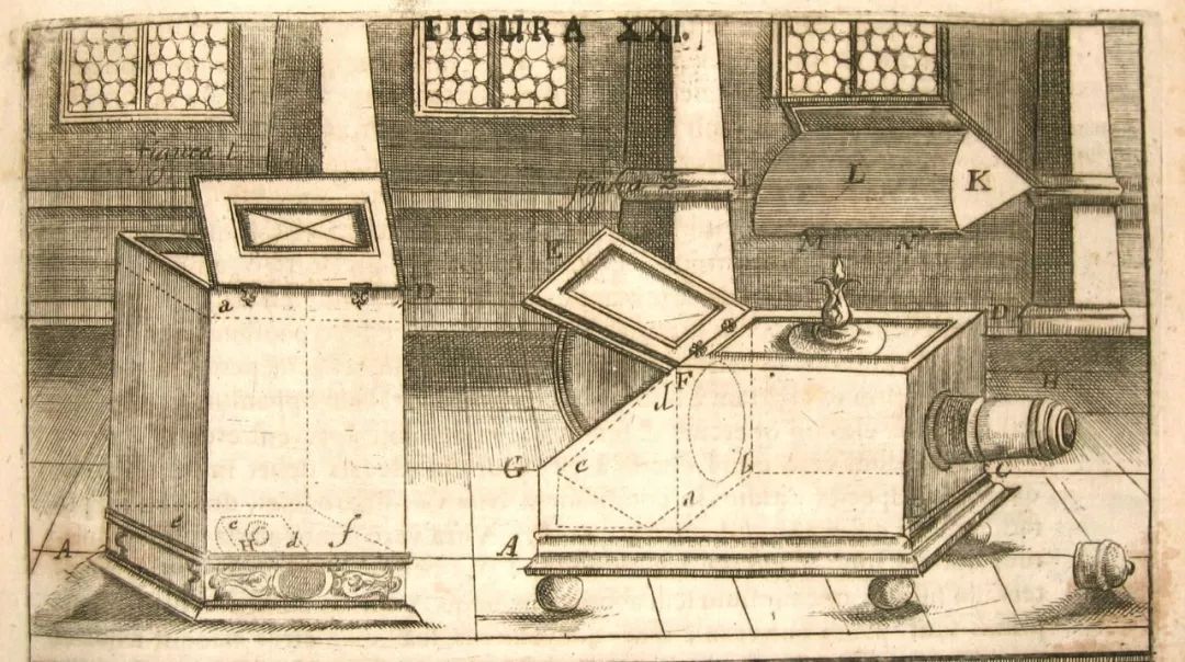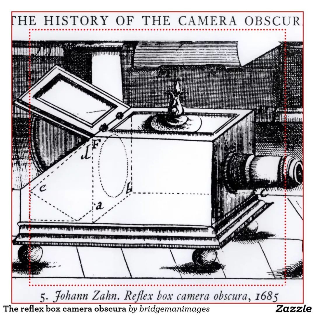 受到小孔成像原理的启发,15世纪的艺术家发明了一款名为暗箱(Camera obscura)的神奇道具,这一形似照相机的光学仪器使得画家可以随时随地捕捉影像。通过在暗箱的磨砂玻璃上放置半透明纸,画家便可以就此准确地画拓出景物的轮廓。