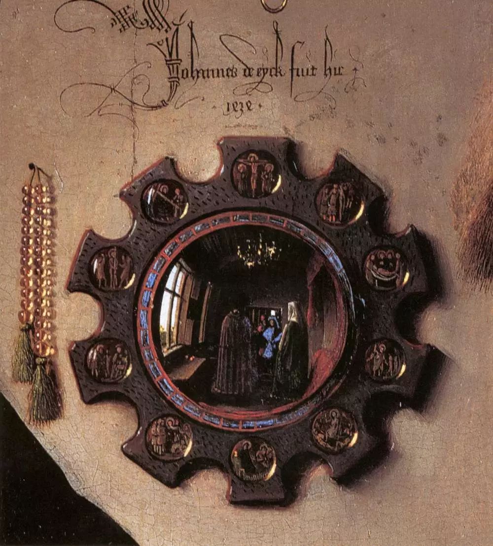 首当其冲的便是其名作《阿尔诺非尼夫妇》(Portrait of Arnolfini and his Wife),画面正中的凸透镜实在有一种“穿帮”的戏剧感,它向我们表明,绘画现场除去阿尔诺非尼夫妇二人与画家本人以外,还有着一位蓝衣的女仆。而在他们之外,现场还隐约存在着一台有趣的光学装置。