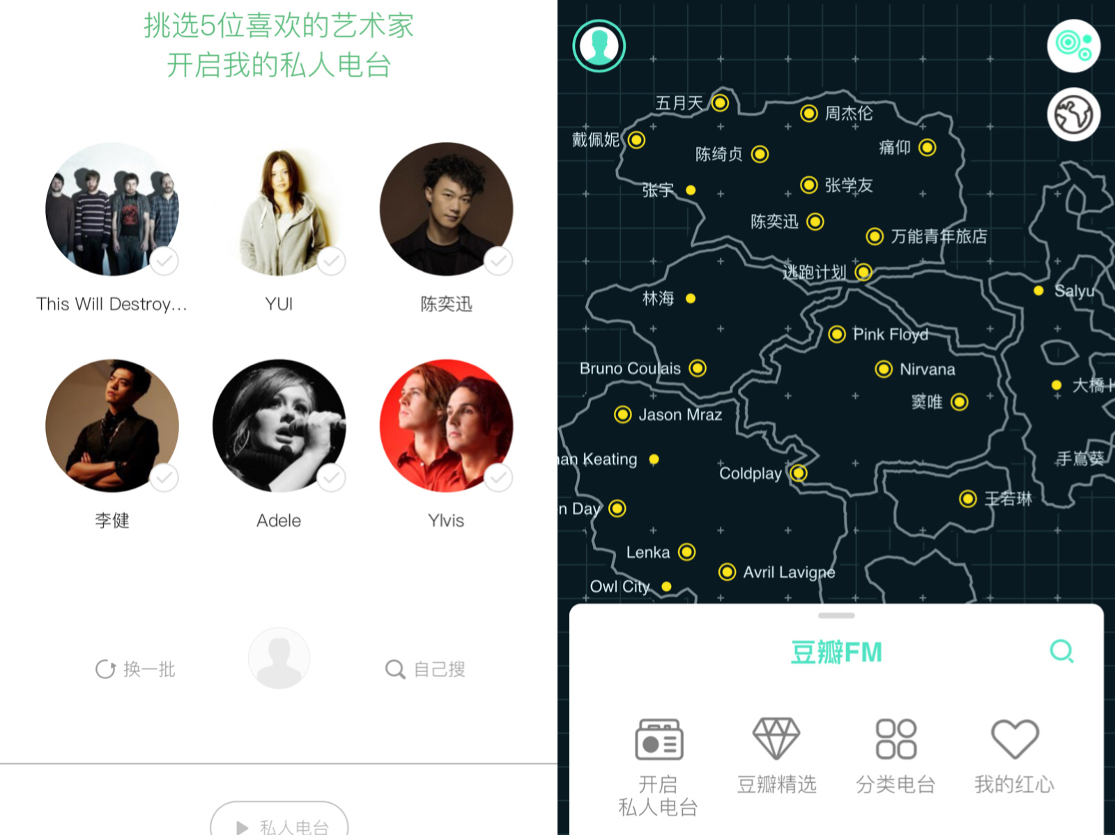 此外,豆瓣 FM 还推出了基于大数据的音乐人地图功能,由于现在用户听歌的领域越来越垂直,豆瓣 FM 希望帮助用户发掘更多符合自己喜好的音乐人。
