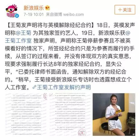 19号,王菊工作室发布声明,表示因未来个人发展与定位与公司诉求和规划无法达成一致,王菊将与英模公司解除经纪合约。