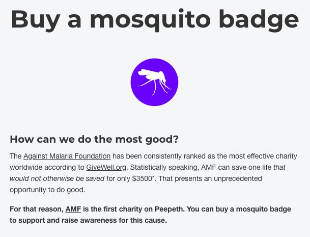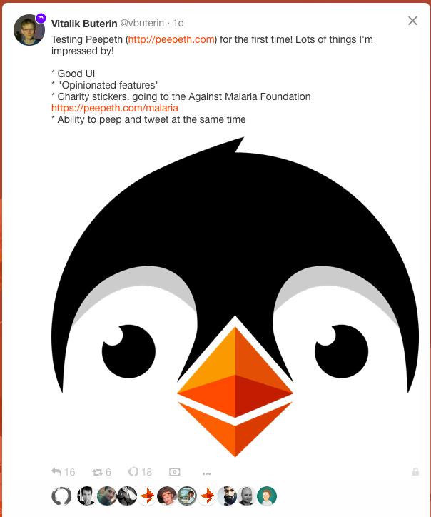 他自己买了一张慈善贴纸,贴在他的 Peepeth 的个人资料上,资金将捐给反疟疾基金会。