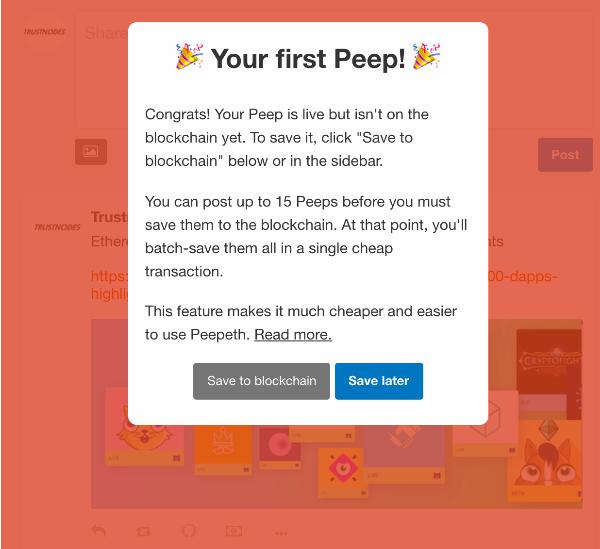 据悉,发 Peep 并不是免费的,每 15 条 Peep 需要强制打包进区块,花费根据打包速度而定,在 0.000028 ETH ~ 0.000330 ETH 之间。另外,用户还可以用ETH对任何一条 Peep 打赏。