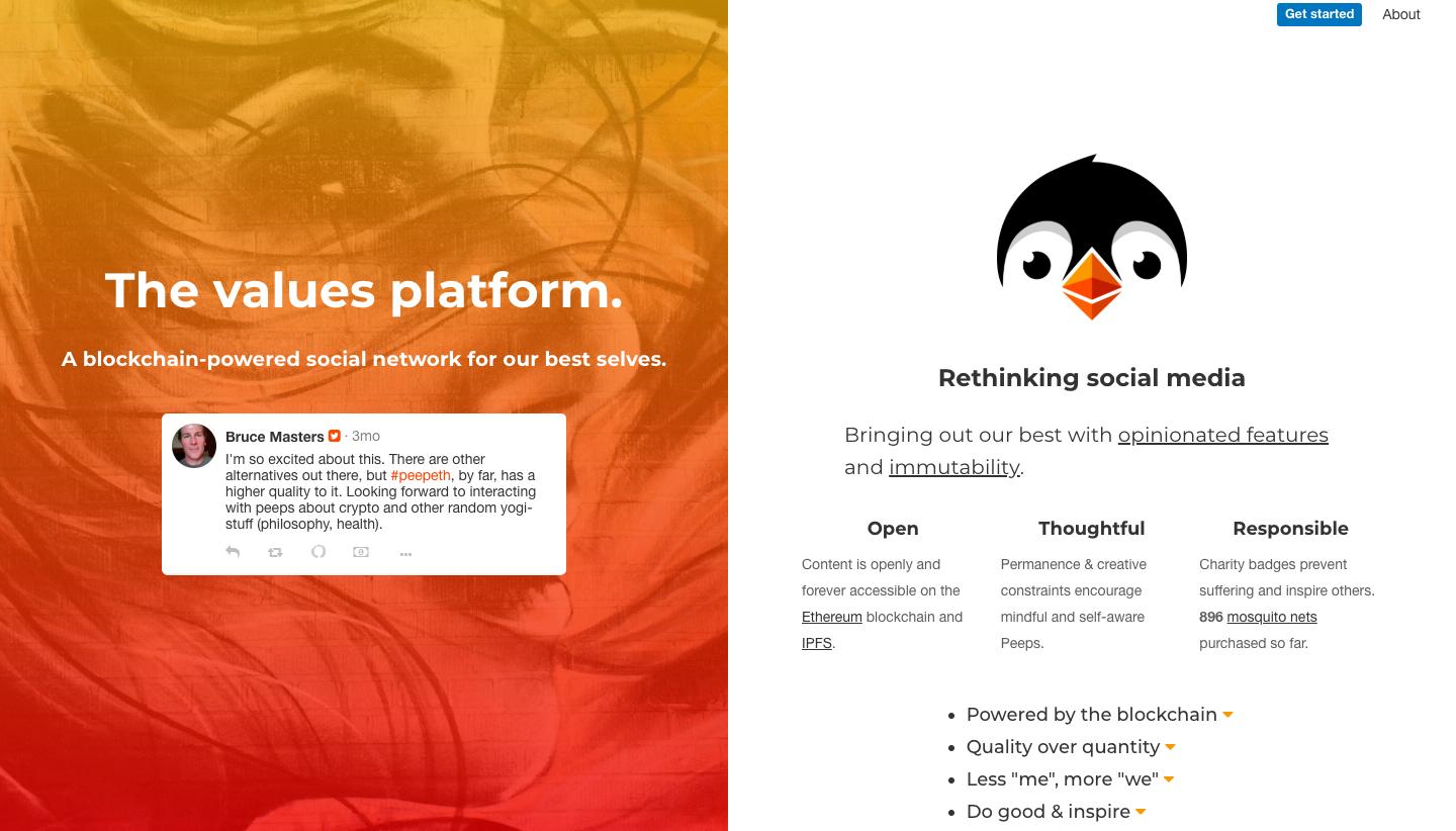 Peepeth 是区块链上的类似微博、Twitter 的社交网站,但在区块链上保护,数据存储在行星间文件系统( IPFS )中,可以在上面发名叫 “Peep” 的消息。Peepeth 的卖点是发 Peep 无机构审查,不会被禁止以及删除。用户可以链接 Twitter 来证明自己的身份,以实现部分“影响力”的转移。