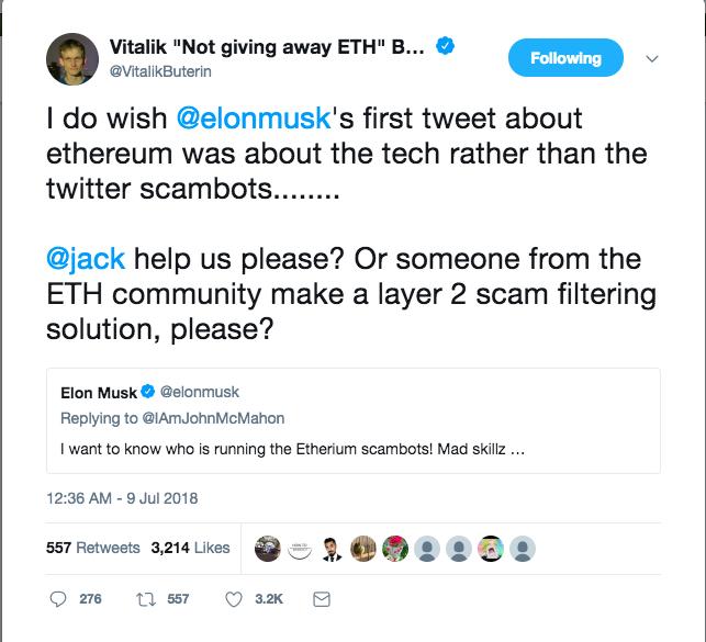 特斯拉 CEO 此前发 Twitter 吐槽:我想知道谁在运行这些以太坊诈骗机器人。Vitalik 转发该推文并表示,他希望马斯克发的第一条以太坊帖子是和技术有关的,而不是 Twitter 上的诈骗机器人。并问 Twitter CEO Jack Dorsey,能不能帮忙解决这个问题,或者以太坊社群有没有人能诈骗过滤解决方案。
