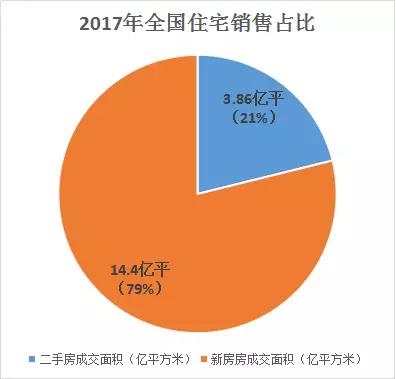 我们先来看一组数据。2017年,全国新房住宅销售面积14.4 亿㎡,而二手房销售386万套,按照平均一套100㎡计算大概是3.86亿㎡,二手房成交量只占住宅总成交量的21.7%。