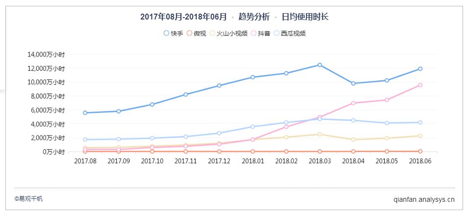 凤凰网科技从易观千帆获取的数据中了解到,在短视频APP日均使用时长上,抖音正在快速接近快手,主要强调的是以抖音、西瓜视频、火山为代表的今日头条系短视频矩阵,正在对快手展开猛烈攻击,三者的总时长已然超越快手,外部的压力无疑是快手又一个增速放缓的原因。