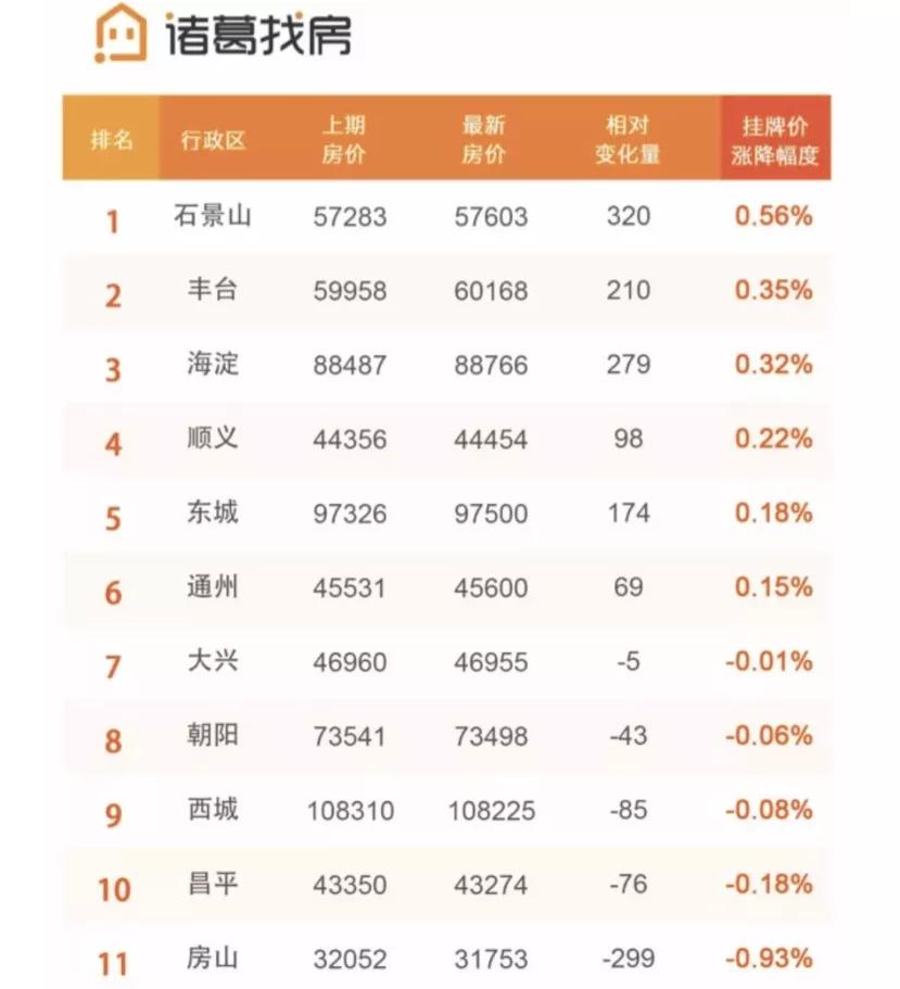据诸葛找房 7 月发布的数据,在北京各区在售二手房平均单价中,西城区挂牌均价最高,为 108225 元/㎡,房山区均价最低,为 31753元 /㎡。在涨降价方面,石景山的挂牌价涨幅最高,达 0.56 %,房山区的挂牌价下跌较大,为 0.93% 。