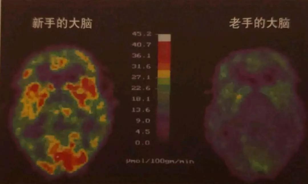 (做同样一个任务,新手与老手完成时大脑的活跃度对比)