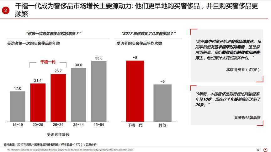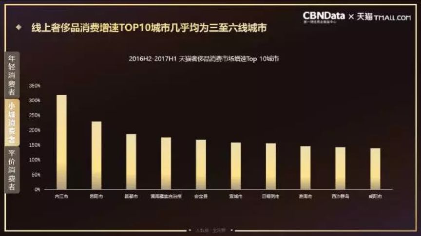 根据去年第一财经和天猫出具的《奢侈品消费趋势报告》及贝恩资本的《2017中国奢侈品市场研究》来看,90后、95后(千禧一代)正逐渐成为奢侈品的消费主力,三四线城市的消费者奢侈品购买件单价已经超过一二线城市,全国奢侈品消费增速最快的城市也都是三至六线城市。