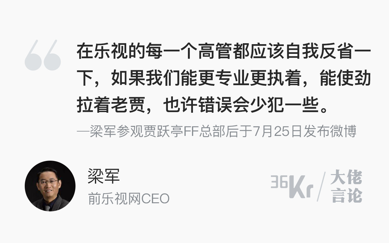 梁军表示,“何止是贾总,在乐视的每一个高管都应该自我反省一下,如果我们能更专业更执着,能使劲拉着老贾,也许错误会少犯一些。”(微博传送门)