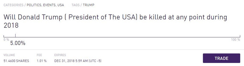 据 CCN 报道,近日,基于以太坊的预测应用 Augur 上出现了针对公众人物的暗杀赌注,这其中首当其冲的就是现任美国总统特朗普。Augur 上名为“特朗普会不会在2018年被杀害(无论通过何种方式)”的事件已吸引了 50 多股的赌注。经计算,这些“群众智慧"给出的预测结果是,特朗普今年意外死亡的概率为5%。沃伦•巴菲特、约翰•麦凯恩、杰夫•贝佐斯、贝蒂•怀特等人的也有。