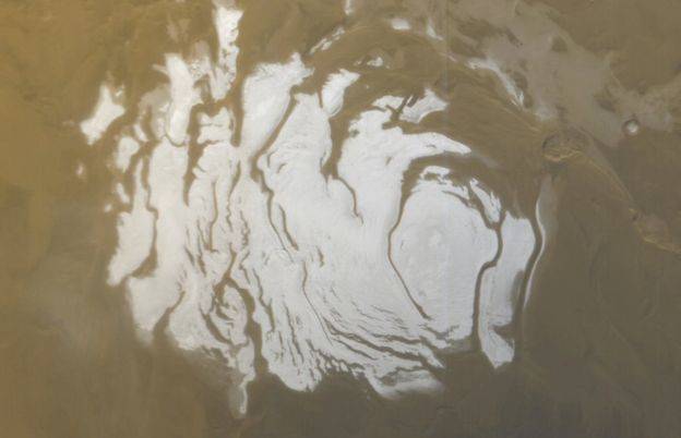 2012 年 5 月至 2015 年 12 月期间,MARSIS 用于调查位于火星南部冰盖的 Planum Australe 地区。它通过地面和极地冰帽发送雷达脉冲,并测量无线电波反射回探测卫星。脉冲反射了 29 组雷达样本,这些样本在距离地面近一英里的地方组合成了一个信号急剧变化的地图,图像上有强烈的对比差异。