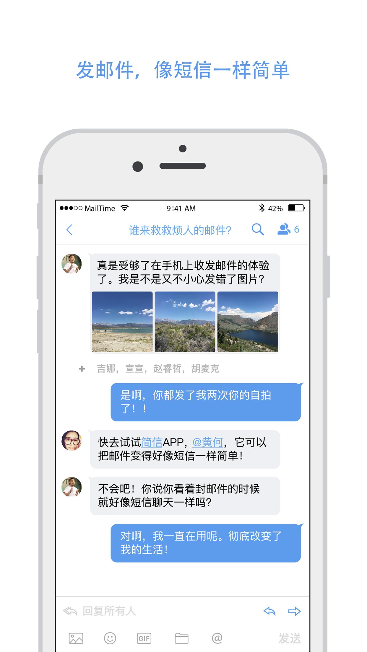 MailTime 简信的产品特点主要体现在“对话式”的邮件界面。它的核心理念是,用短信式的设计简化邮件臃肿的界面,同时打破即时通讯软件造成的壁垒,基于邮件这个开放协议,提高线上沟通的效率。MailTime 简信创始人黄何告诉36氪,该应用目前在全球已获近千万下载量。