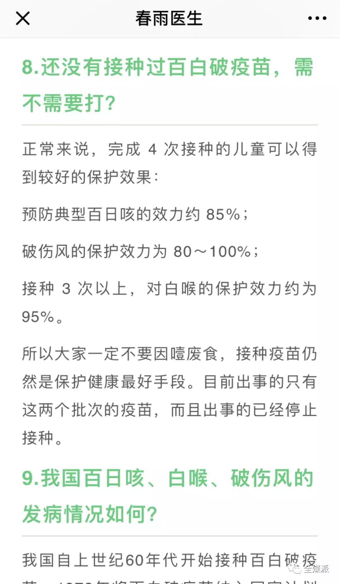 在医疗领域的朋友推荐后,我去仔细看了公众号丁香医生在22日推出的文章,这篇文章内容简短,解答了长春百白破疫苗存在有效性问题后,父母最为关心的七个问题,包括“问题疫苗的主要流向地”、“假疫苗指向的具体问题和后果等”、“能否不给孩子打疫苗等?”