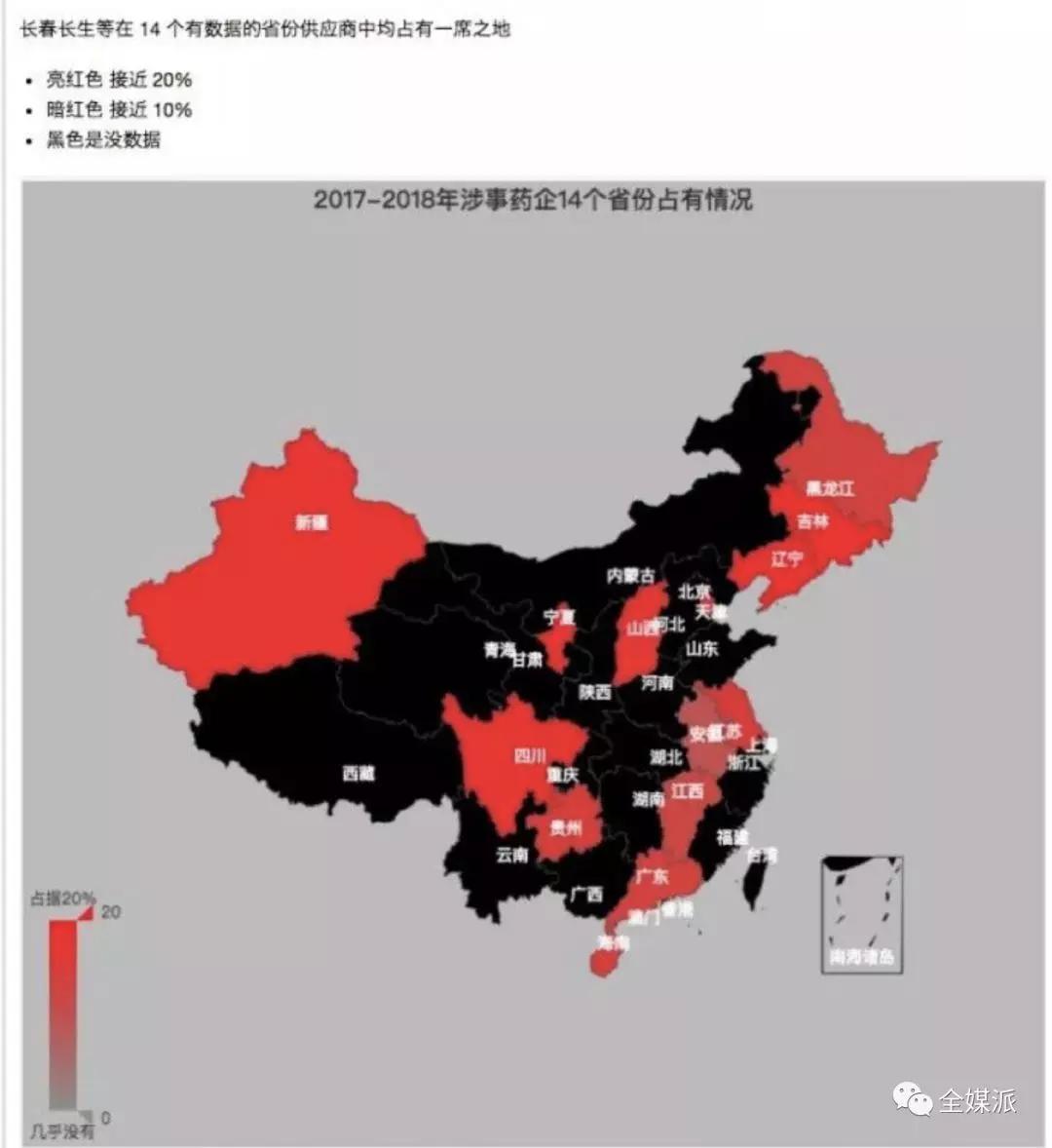 程序员“wstart”从各大省市二类疫苗采购等公开信息里,以2017年、18年两年为时间周期,进行了大数据运算,并将所有数据和代码开源到了GitHub。借助可视化技术,绘制了问题疫苗在全国的流动情况。在部分省市数据不可得情况下,分析得出了涉事企业在14个省市的市场占有情况,其中吉林、辽宁、四川等省份的市场占有率达到20%。