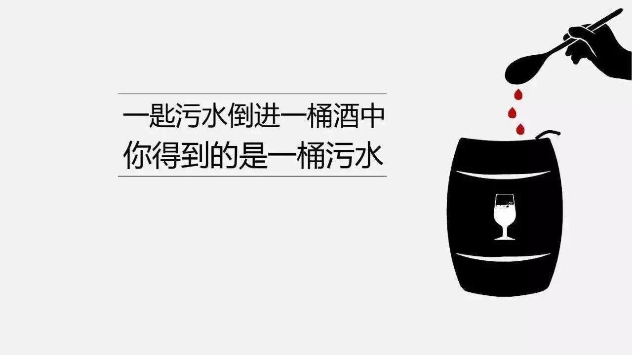有个著名的“酒与污水定律”,说的是:一匙酒倒进一桶污水,得到的是一桶污水;把一匙污水倒进一桶酒里,得到的还是一桶污水。