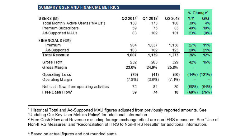 音乐流媒体公司Spotify公布了截至2018年6月30日的2018年第二财季的财务业绩。报告显示,Spotify总收入12.73亿欧元(约101亿人民币),同比增长26%,营业亏损为9000万欧元(7.14亿人民币),约占总收入的7%。