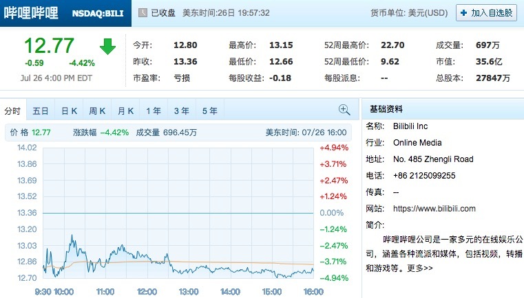 昨日消息公布后,B站股价盘前一度跌超10%。后跌幅收窄,收盘跌幅4.42%,股价为12.77美元。