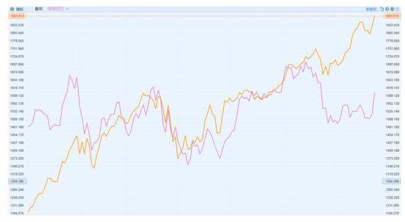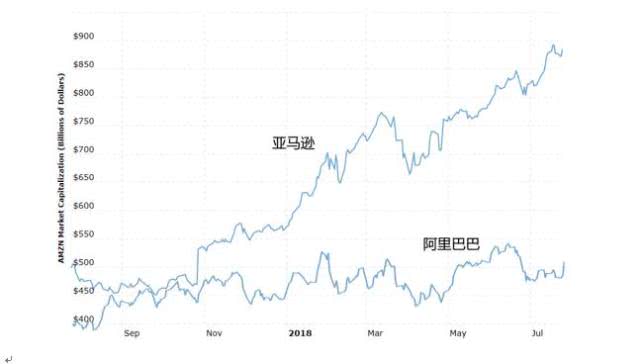 如上图所示,自2018年1月2日至今,亚马逊(橙色线)的累计涨幅达到近60%,相比之下阿里巴巴(紫色线)只有15%不到,转化成市值,两边的差距自2017年末便开始逐步拉大,短短不到一年时间,亚马逊就已经超过了阿里市值近1倍: