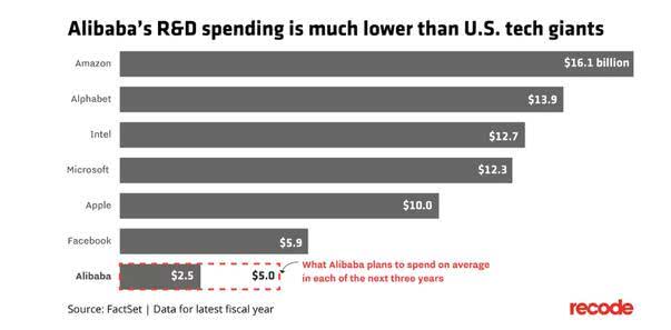 反观阿里这边,尽管在去年宣布成立“达摩院”,未来3年在研发方面投入1000亿元(约合150亿美元),即平均每年50亿美元,但仍远远落在美国科技巨头后面,甚至还不到亚马逊的三分之一。