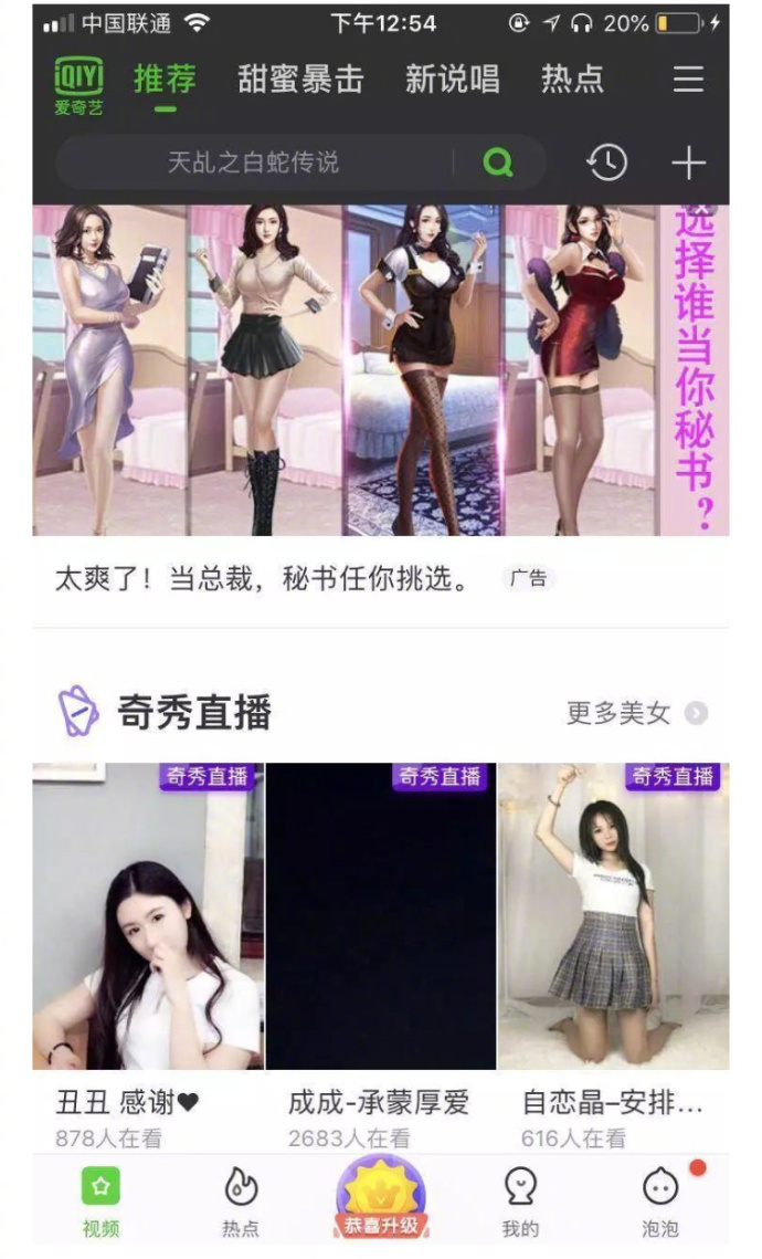 据《新京报》报道,在爱奇艺App上存在很多低俗广告,类型以言情小说、游戏为主。一位爱奇艺的广告代理商表示,爱奇艺的广告审核相对宽松。