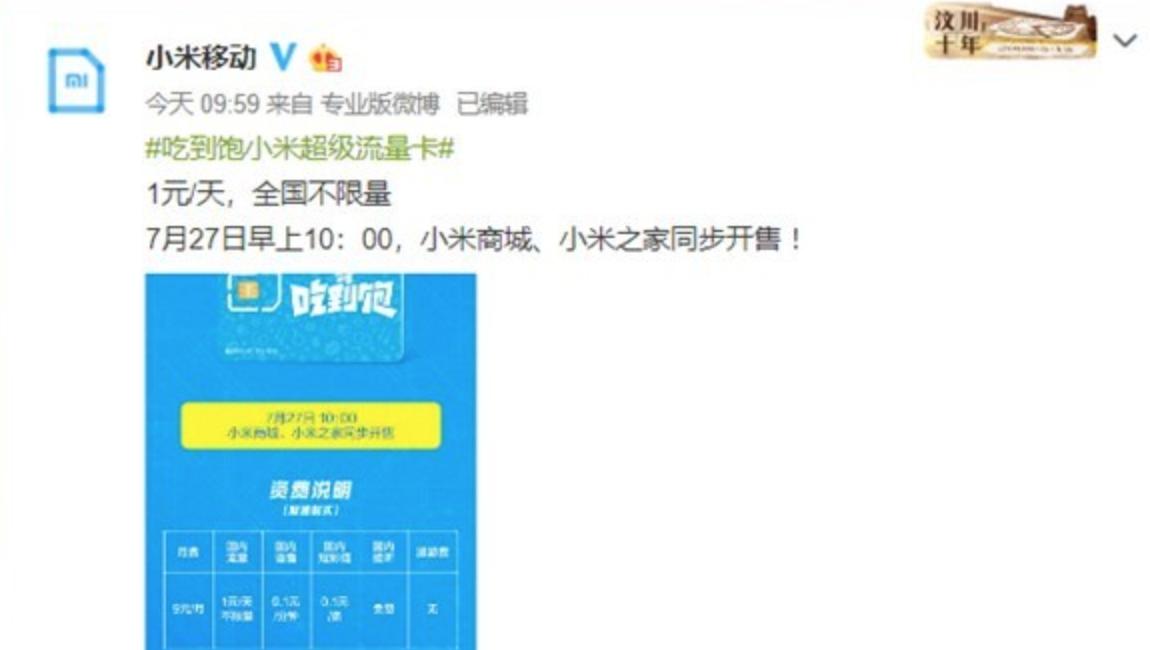 小米吃到饱流量卡首卖:月费9元,每天1元