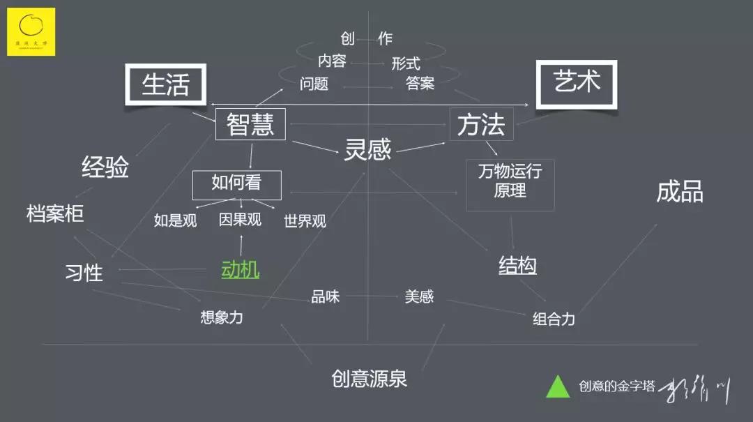 其实人人都有创意,创意金字塔这张图,基本代表了我对创意的完整看法。如果你问我图中最重要的词是哪个,那就是“动机”。