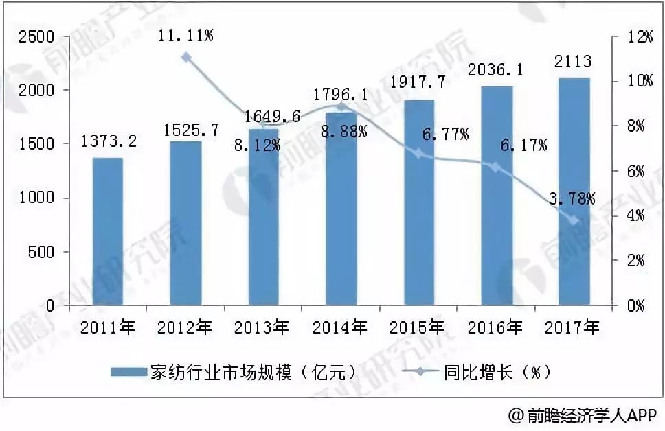 据前瞻产业研究院发布的《互联网+家纺行业市场前瞻与投资战略规划分析报告》数据显示,2011-2017年我国家纺行业市场稳步发展,市场规模逐年扩大,但增速下行。2017年,我国家纺行业市场规模达到2113亿元,较2016年的2036.1亿元,同比增长3.78%。下图是2011-2017年家我国家纺行市场规模: