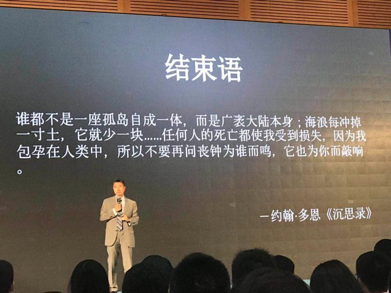 我引用英国诗人约翰多恩的一首诗结束讲座,这是海明威在他的名著《丧钟为谁而鸣》开篇引用的,是这样的一段话: